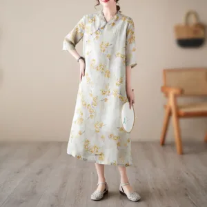 73.04$Original price was: 73.04$.52.59$Current price is: 52.59$.Mythstone Yellow Flowers Print Cheongsam Midi Dress Cotton Linen Half Sleeve Dress With Pockets