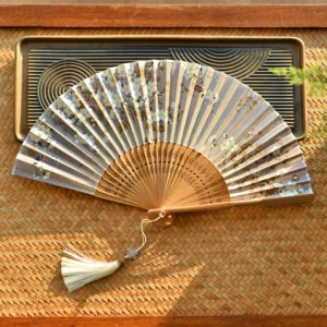 87.45$Original price was: 87.45$.65.59$Current price is: 65.59$.Mythstone Crane Dragonfly Lotus Peony Plum Blossom Butterfly Handheld Silk Bamboo Folding Fan 22.5cm