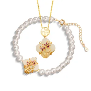 72.04$Original price was: 72.04$.52.59$Current price is: 52.59$.Mythstone 925 Sterling Silver Hetian Jade Orchid Four Leaf Clover Fu Character Pearl Luck Necklace Pendant Bracelet Set