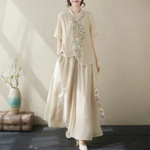 $99.43Original price was: $99.43.$71.59Current price is: $71.59.Mythstone 2Pcs Frog-Button Long Sleeve Shirt Wide Leg Pants Meditation Cotton Linen Clothing