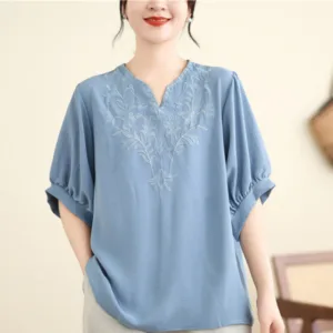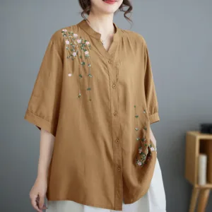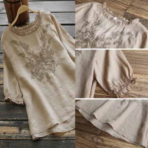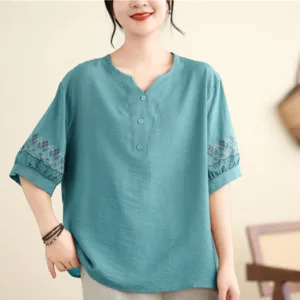 63.45$Original price was: 63.45$.47.59$Current price is: 47.59$.Mythstone Vintage Flowers Leaves Embroidery Half Sleeve Cotton Linen T-shirt Tee