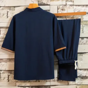 $70.12Original price was: $70.12.$52.59Current price is: $52.59.Mythstone 2Pcs Tree Pattern Cotton Linen Frog-Button Short Sleeve Shirt Pants Men’s Set