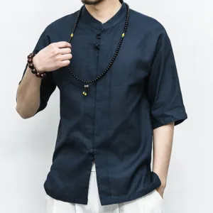 55.76$Original price was: 55.76$.39.59$Current price is: 39.59$.Mythstone Frog-Button Chinese Tang Suit Half Sleeve Shirt Cotton Linen Men Clothing