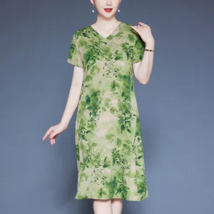 88.15$Original price was: 88.15$.62.59$Current price is: 62.59$.Mythstone V-Neck Green Leaves Flowers Pattern Short Sleeve Midi Dress With Pockets