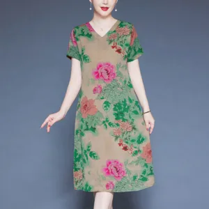 75.12$Original price was: 75.12$.55.59$Current price is: 55.59$.Mythstone V-Neck Green Red Peony Colorful Flowers Short Sleeve Midi Dress With Pockets