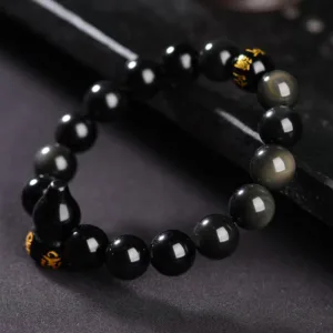 Mythstone Natural Silver Sheen Obsidian Black Obsidian Om Mani Padme Hum Pixiu Protection Bracelet
