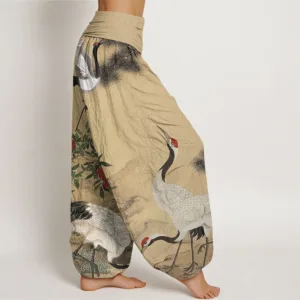 Mythstone Casual Red-crowned Crane Pine Tree Mountain Women’s Elastic Waist Harem Pants