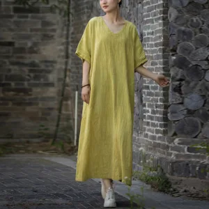 157.76$Original price was: 157.76$.113.59$Current price is: 113.59$.Mythstone Solid Color V-Neck Half Sleeve Ramie Linen Midi Dress With Pockets