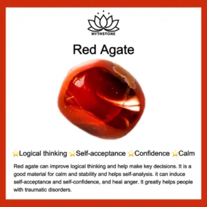 Red agate can improve logical thinking and help make key decisions. It is a good material for calm and stability and helps self-analysis. It can induce self-acceptance and self-confidence. and heal anger. It greatly helps people with traumatic disorders.