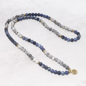 108 Natural Picasso Jasper & Blue Stone Mala Bead Lotus Pendant Bracelet consists of 108 beads including Picasso jasper and blue stone. The gorgeous Picasso Jasper stones have a bedazzling color to them that really suits their effects on your energy levels. These stones will steadily increase your energy levels and stamina during the course of wearing them.
