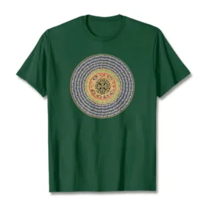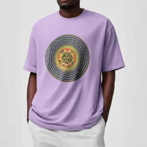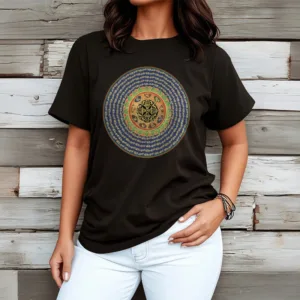 A mala on a T-shirt! Featuring 108 repetitions of the mantra “Om Mani Padme Hum.” The number 108 represents the beads on a mala. used for chanting a mantra. Protect yourself with this powerful mantra!