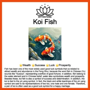 Fish has always been one of the most widely used good luck symbols that co-related to attract wealth and abundance in the Feng Shui world. because the word fish in Chinese (Yu) sounds like “Surplus”. representing an overflow of good fortune. In addition. fish belong to the water element and in Chinese belief. water also symbolizes wealth and prosperity. Besides these. koi fish is also a symbol of success and determination. In addition. the koi is tied to the yin yang symbol. In fact. the black and white teardrops of the yin yang symbol are said to be representations of two koi. one male and one female. Therefore. a pair of koi is often used as a good luck symbol for a happy marriage.