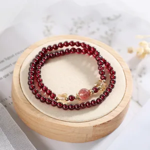 The Mythstone Double Wrap Bracelet combines elegance and spirituality. featuring 14K gold plating and natural garnet strawberry quartz. Its butterfly motif symbolizes protection and transformation. Ideal for those seeking a stylish accessory with spiritual significance. perfect for both casual and formal occasions.