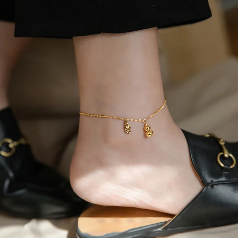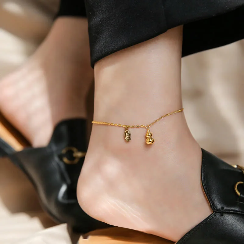 Discover our Mythstone 18k Gold Lucky Gourd Design Wealth Buckle Anklet. a symbol of prosperity and luck. Crafted with copper. it balances your spiritual energies. attracts wealth. and connects you with higher dimensions. Embrace self-care and healing while enhancing your overall abundance with this elegant and meaningful accessory.