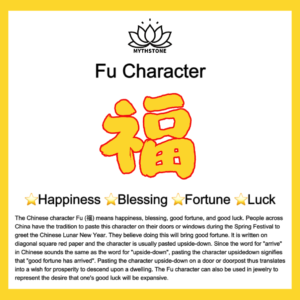 The Chinese character Fu (??) means happiness. blessing. good fortune. and good luck. People across China have the tradition to paste this character on their doors or windows during the Spring Festival to greet the Chinese Lunar New Year. They believe doing this will bring good fortune. It is written on diagonal square red paper and the character is usually pasted upside-down. Since the word for “arrive” in Chinese sounds the same as the word for “upside-down”. pasting the character upside-down signifies that “good fortune has arrived”. Pasting the character upside-down on a door or doorpost thus translates into a wish for prosperity to descend upon a dwelling. The Fu character can also be used in jewelry to represent the desire that one’s good luck will be expansive.
