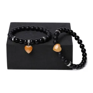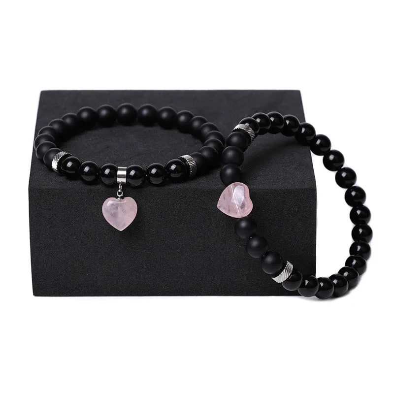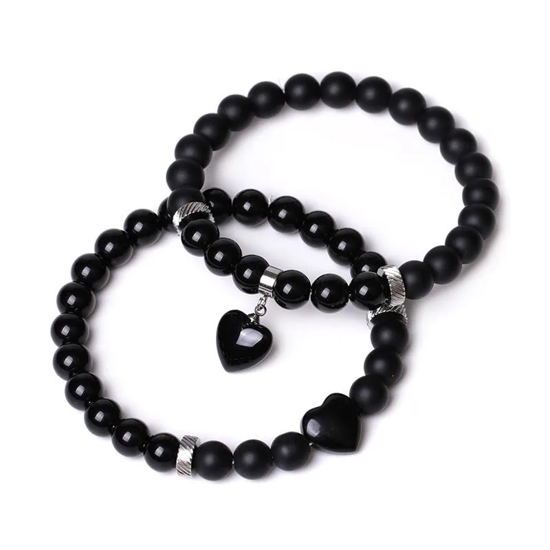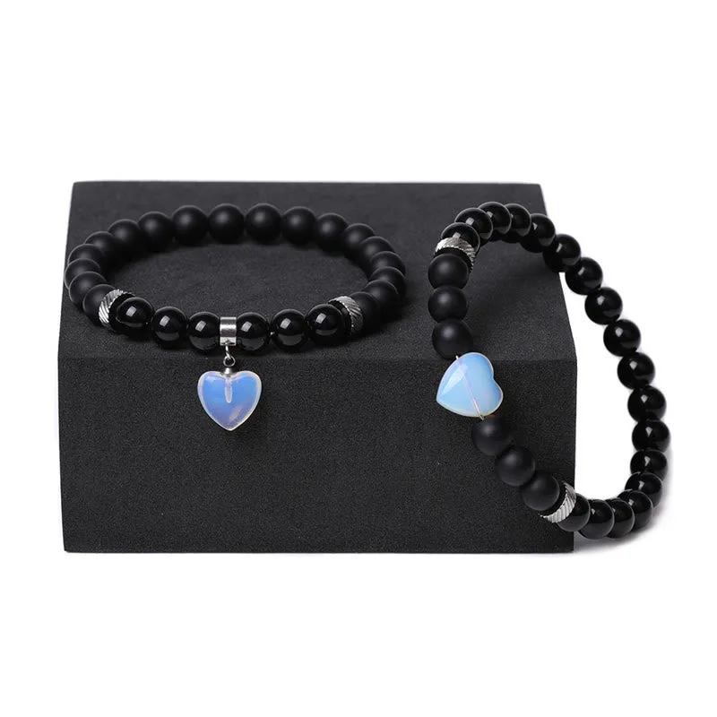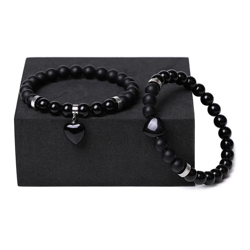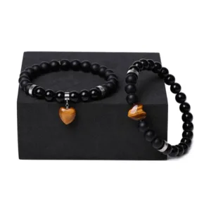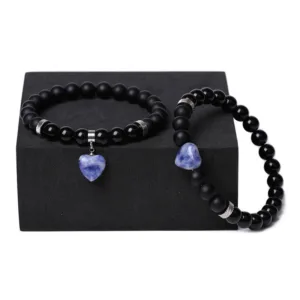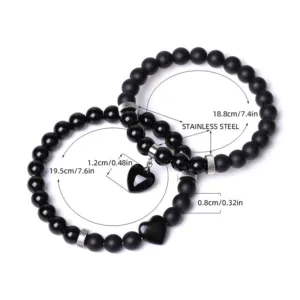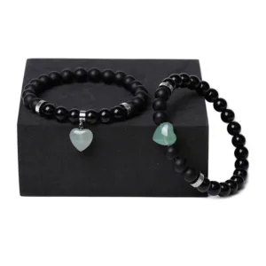 Unite in harmony with the Mythstone Onyx Heart Couple Bracelet. This set of two features black onyx crystals and love heart charms. offering protection and support. Symbolizing a strong bond and emotional resilience. these bracelets are not just accessories but a testament to shared strength and affection. perfect for couples seeking a spiritual connection.