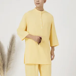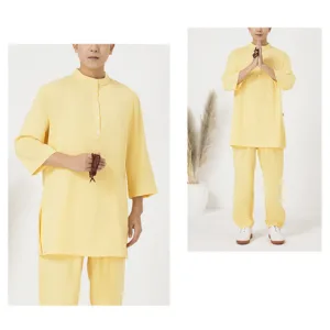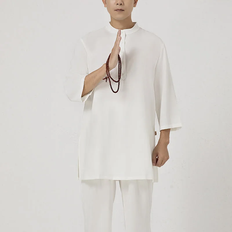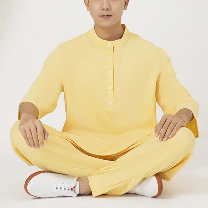Buttons Men’s Three Quarter Sleeve shirt top and pants set is crafted from breathable cotton linen. ideal for meditation and Tai Chi. The comfortable design ensures ease of movement. while the simple button details add a touch of elegance. This set promotes relaxation and focus. making it a perfect choice for those seeking to enhance their spiritual practices with comfort and style.