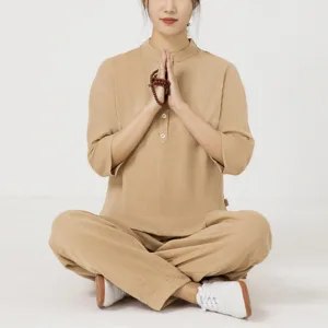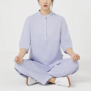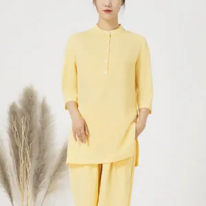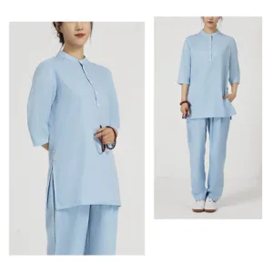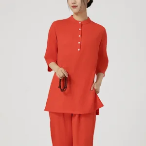 Buttons Three Quarter Sleeve shirt top and pants set for women is crafted from breathable cotton linen. perfect for meditation and Tai Chi. The comfortable design ensures ease of movement. while the button details add a touch of elegance. This set promotes tranquility and focus. making it an ideal choice for enhancing spiritual practices and maintaining a serene. comfortable experience.