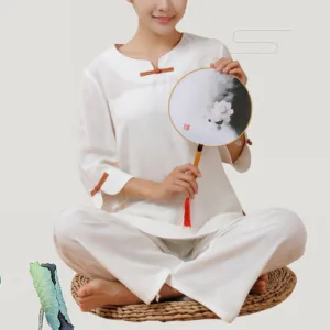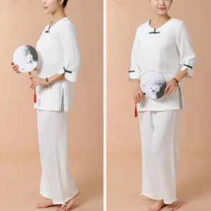 Frog-Button Three Quarter Sleeve shirt top and pants set for women is crafted from breathable linen. perfect for meditation and Tai Chi. The traditional frog-button design adds elegance. while the comfortable fabric ensures ease of movement. This set promotes tranquility and focus. making it an ideal choice for enhancing your spiritual practices and maintaining a serene. comfortable experience.