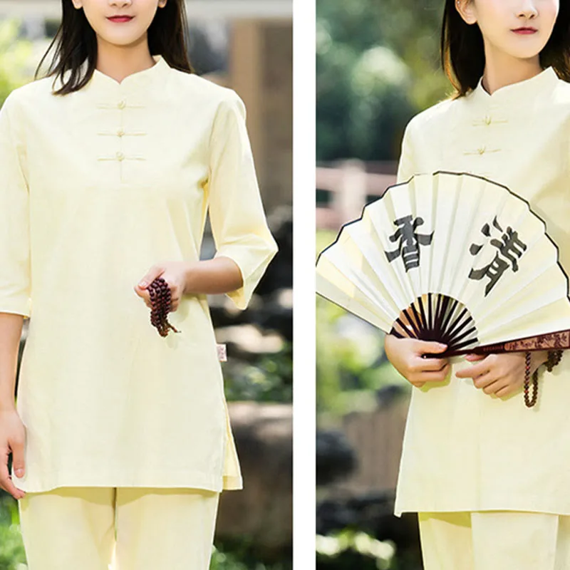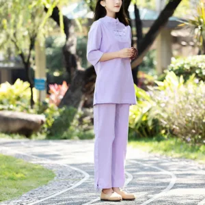Meditation Cotton Linen Clothing Women’s set merges comfort with mindfulness. Crafted from breathable cotton-linen blend. this set features a half sleeve shirt top and pants for unrestricted movement during meditation or Tai Chi practice. Its minimalist design and natural fabric embody simplicity and tranquility. allowing wearers to focus on their inner journey and spiritual practice.