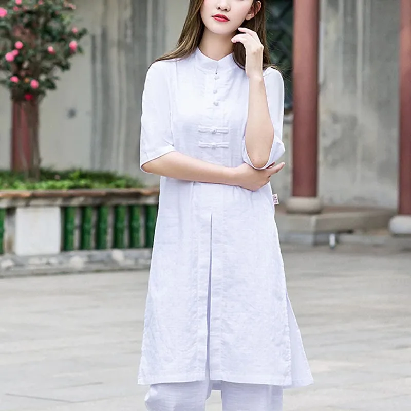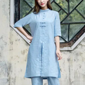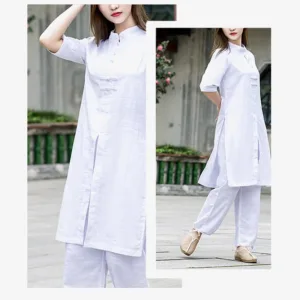 Half Sleeve Linen set is meticulously designed for meditation and Tai Chi practices. This women’s ensemble includes a half-sleeve shirt and pants made from high-quality linen. promoting breathability and comfort. The relaxed fit allows for unrestricted movement. aiding in the seamless execution of spiritual exercises and contributing to a tranquil and focused practice environment.