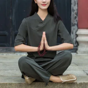 Half Sleeve V-Neck Shirt Top Pants set is perfect for meditation. Zen practice. and Tai Chi. Made from breathable linen. this set includes a half sleeve V-neck shirt and comfortable pants. allowing for unrestricted movement and relaxation. The minimalist design promotes mindfulness and inner peace. making it an ideal choice for those seeking tranquility in their spiritual practices.