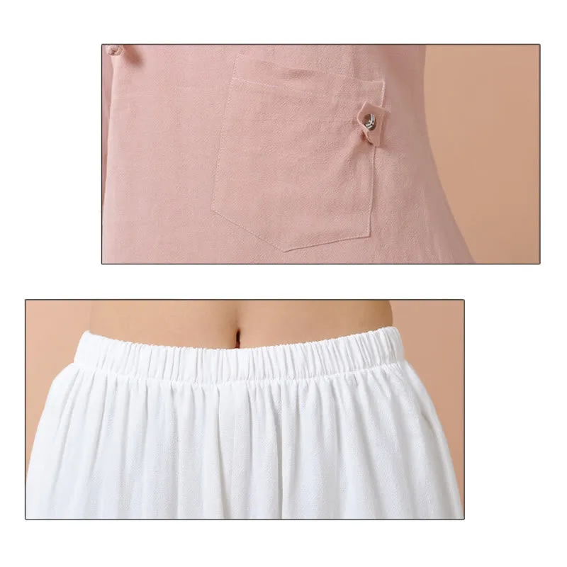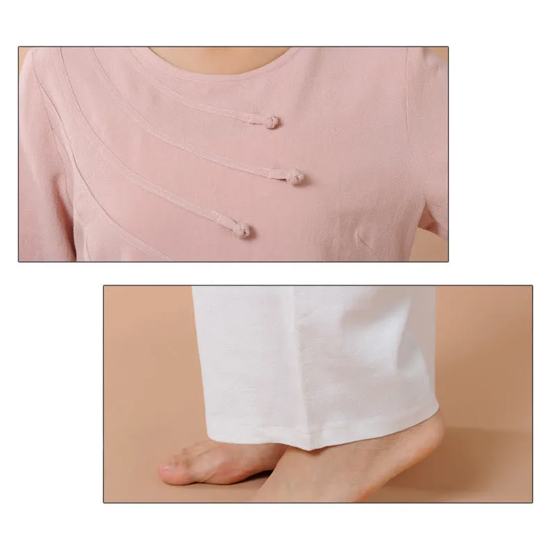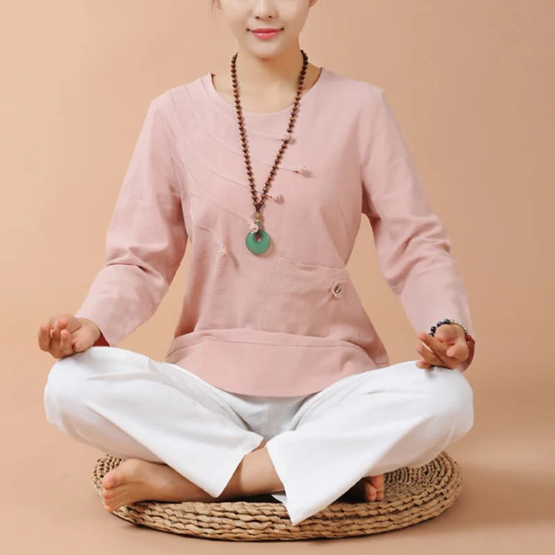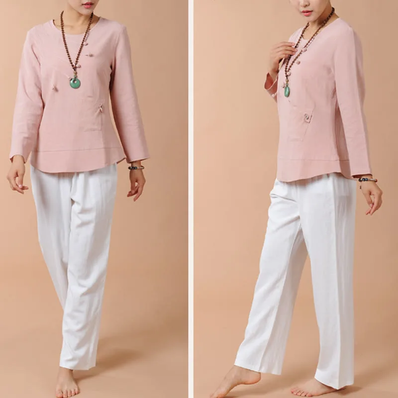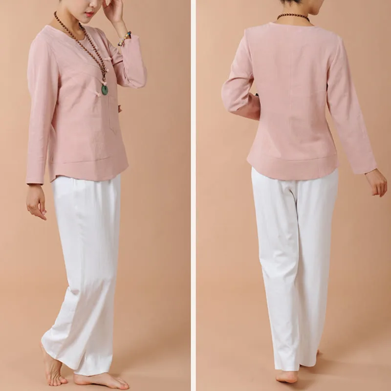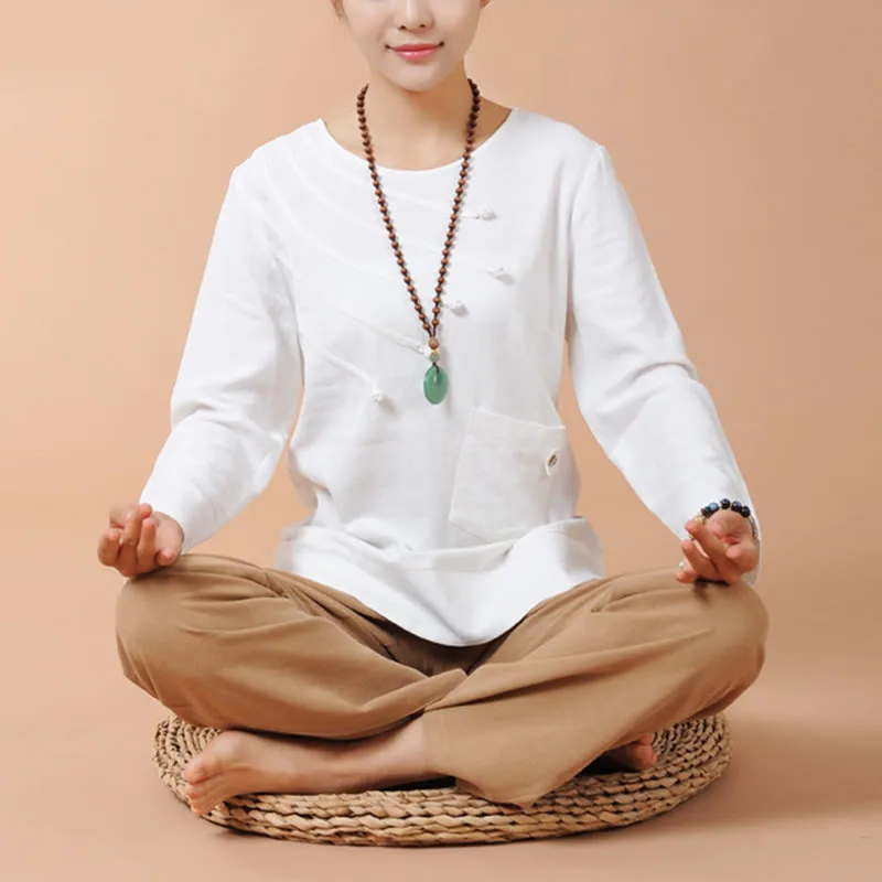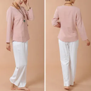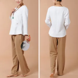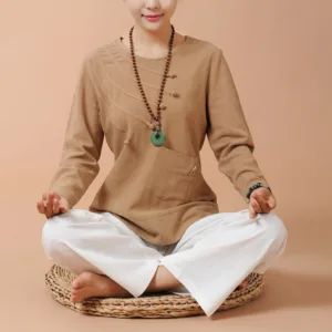 Long Sleeve T-Shirt Tee and pants set for women is crafted from breathable linen. perfect for meditation and Tai Chi. The comfortable design ensures ease of movement. while the soft fabric promotes relaxation. This set is ideal for enhancing your spiritual practices. providing a serene and comfortable experience that helps maintain focus and tranquility.