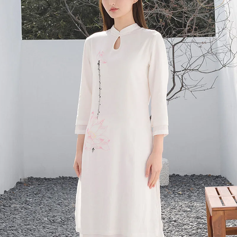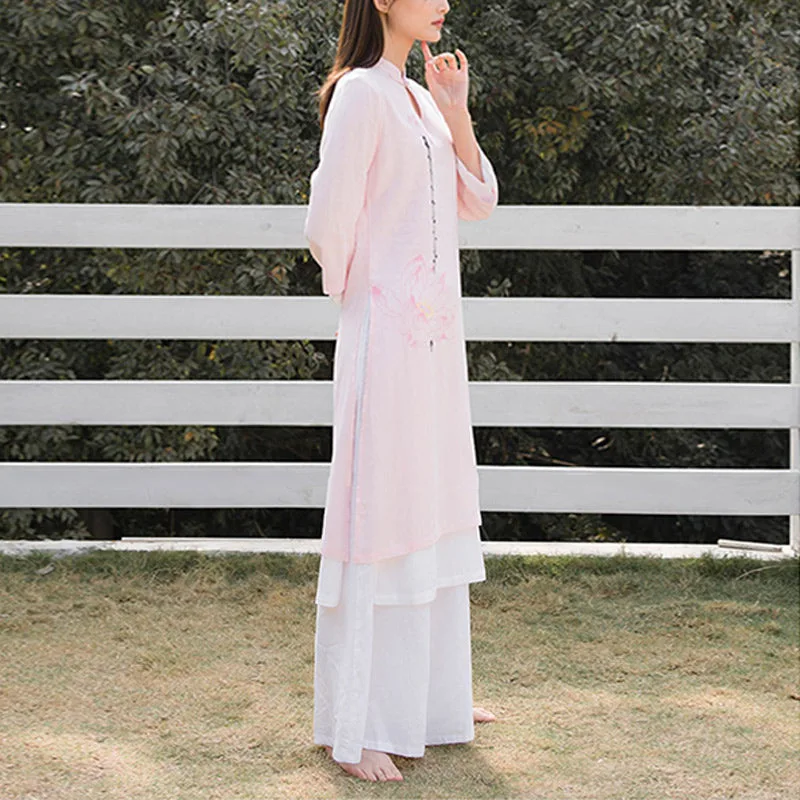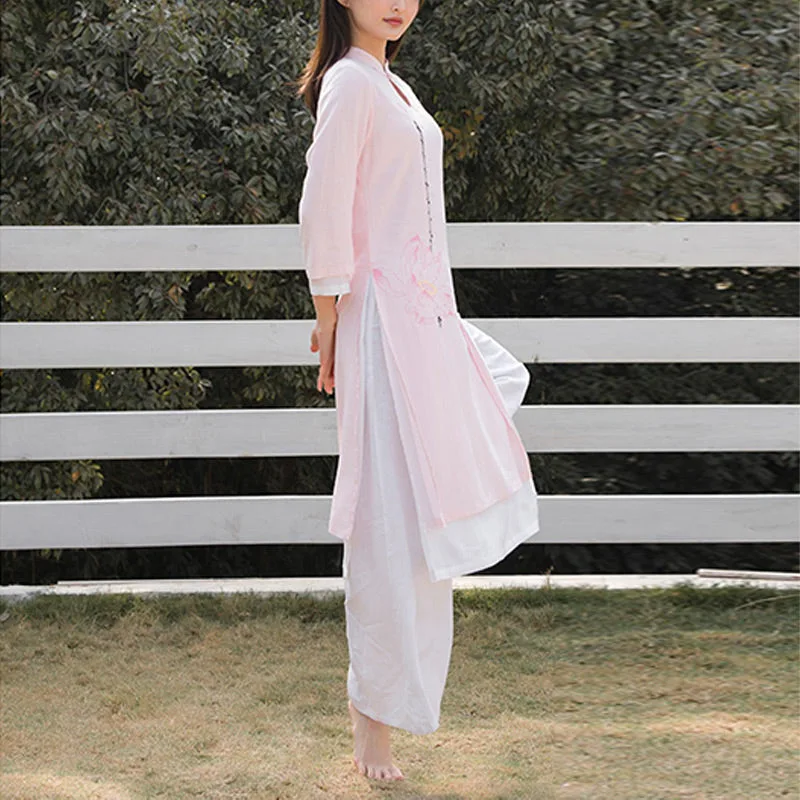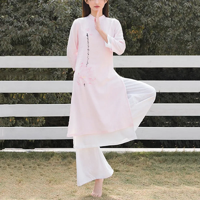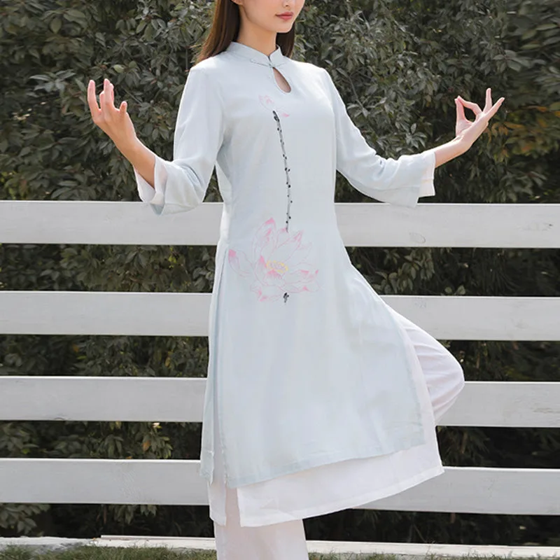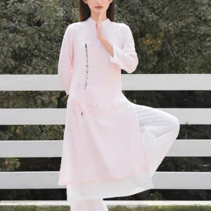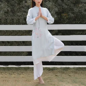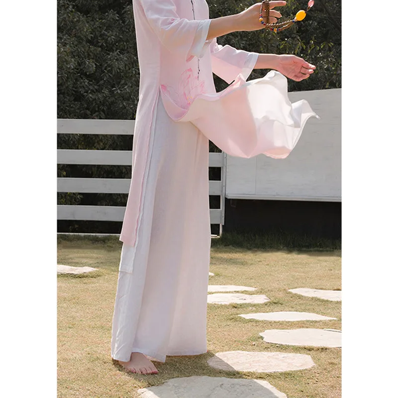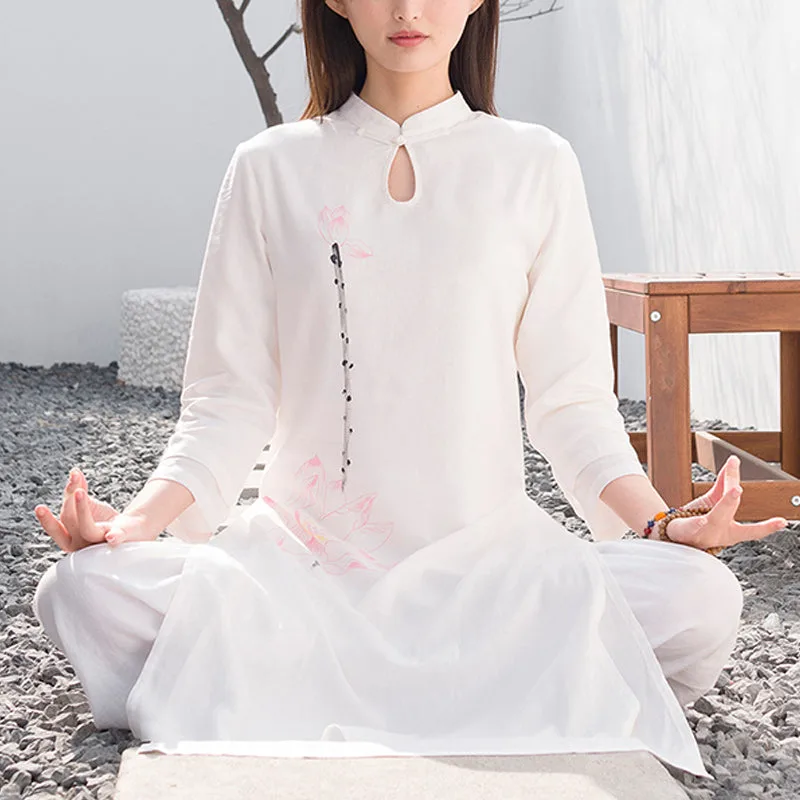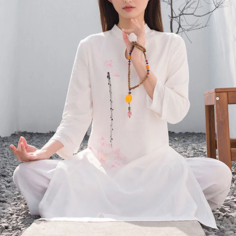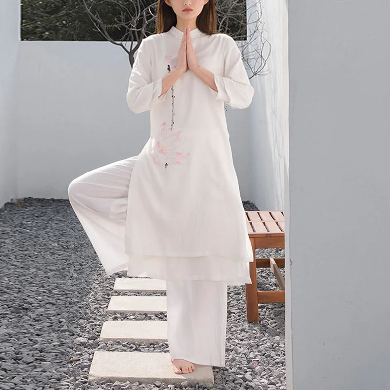 This Mythstone Lotus Pattern Set. crafted from a harmonious blend of cotton and linen. is adorned with a delicate lotus pattern. symbolizing purity. enlightenment. and rebirth. Perfect for women engaged in tai chi. meditation. or yoga. this top and pants ensemble enhances your spiritual practice with its meaningful design and exceptional comfort. The breathable fabric allows for a full range of motion. while the lotus motif serves as a constant reminder of your growth and transformation.
