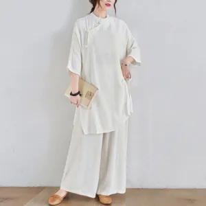 Discover the essence of tranquility and movement with this cotton linen top and pants set. designed for Zen Tai Chi and meditation practices. The plain design emphasizes simplicity and freedom. allowing for unimpeded flow of movement and breath. Ideal for those seeking comfort and a deeper connection to their spiritual practice. this set supports a harmonious balance between the body and mind. making it perfect for meditation. Tai Chi. or as a serene addition to your daily wardrobe.