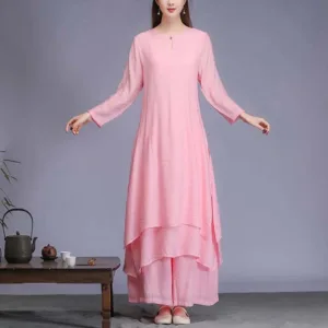 2Pcs Solid Color Midi Dress Wide Leg pants set is designed for meditation. spiritual practice. yoga. and dance. The breathable fabric ensures comfort. while the wide-leg pants and midi dress provide freedom of movement. The solid color scheme reflects simplicity and tranquility. making this set perfect for those seeking inner peace and mindfulness in their practices.