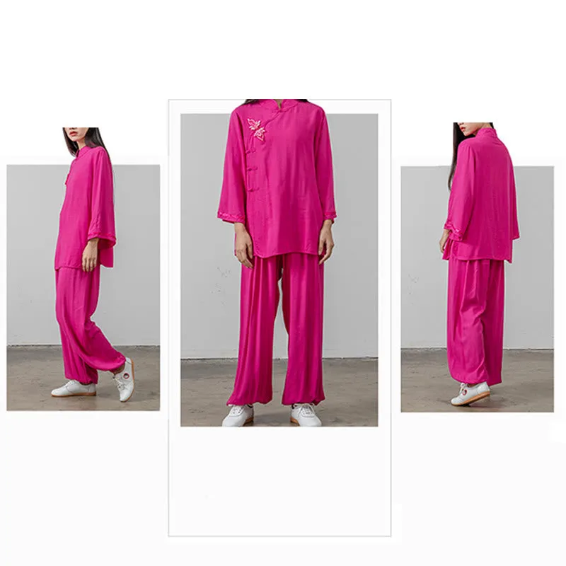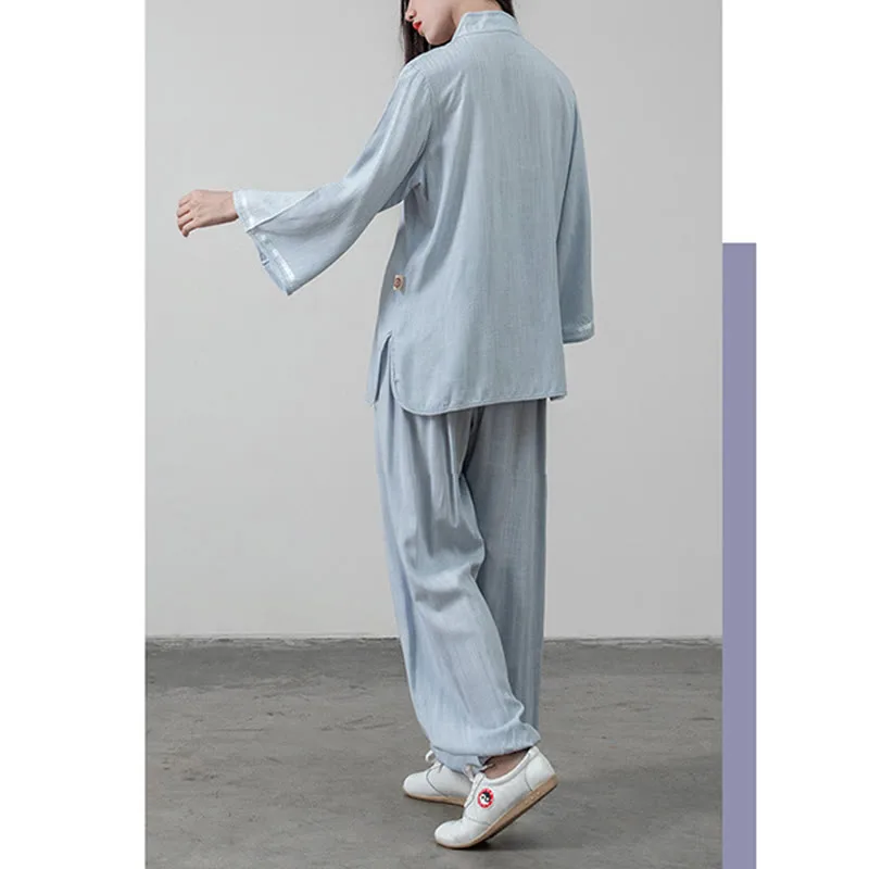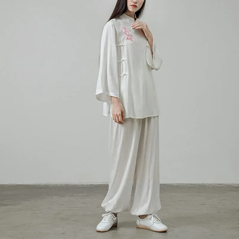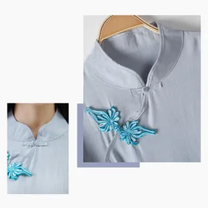Frog-Button Tang Suit set is ideal for deepening meditation and Tai Chi practices. This women’s cotton linen set pairs a shirt top with pants. offering a traditional and comfortable fit. The unique frog-button closures not only add an authentic touch but also symbolize longevity and wisdom in practice. enhancing the spiritual connection in each movement.