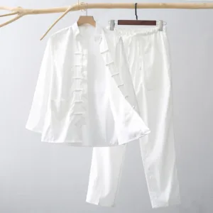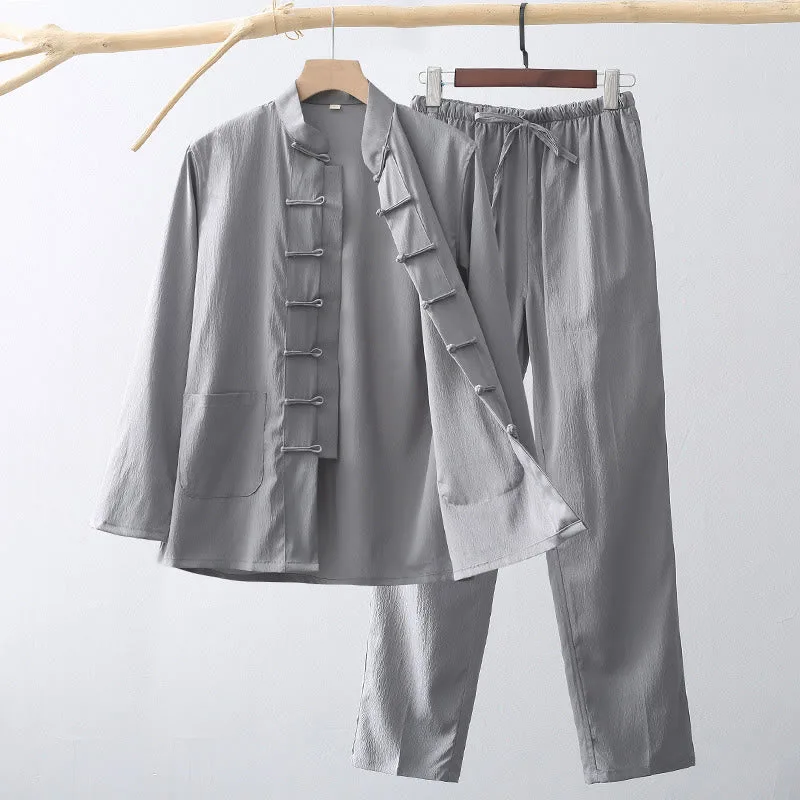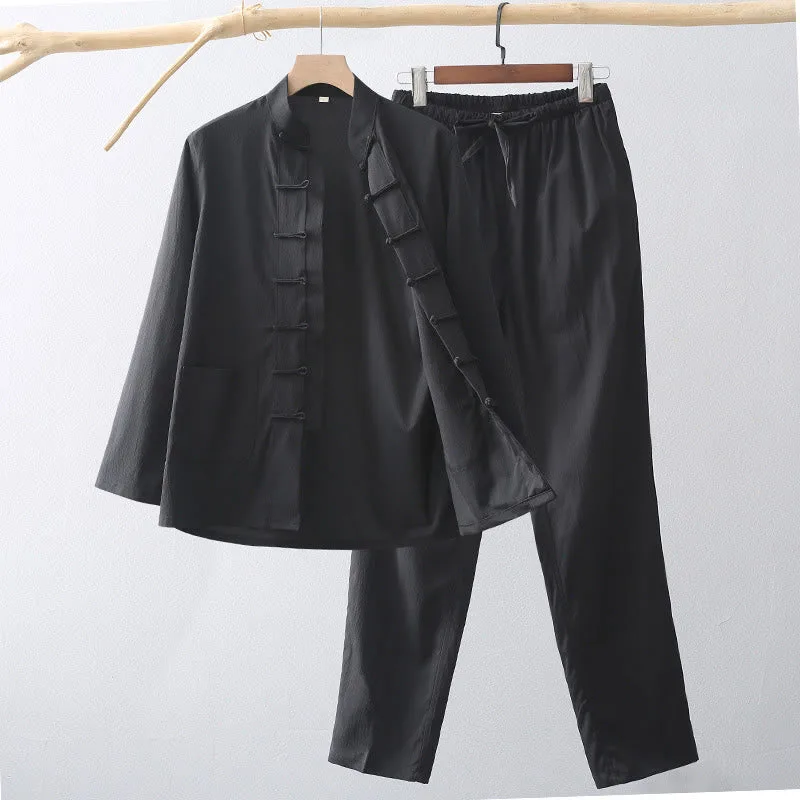 Mythstone 2Pcs Tang Suit Traditional Frog-Button Men’s Long Sleeve Shirt Pants Clothing Set