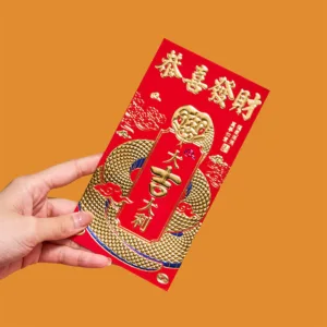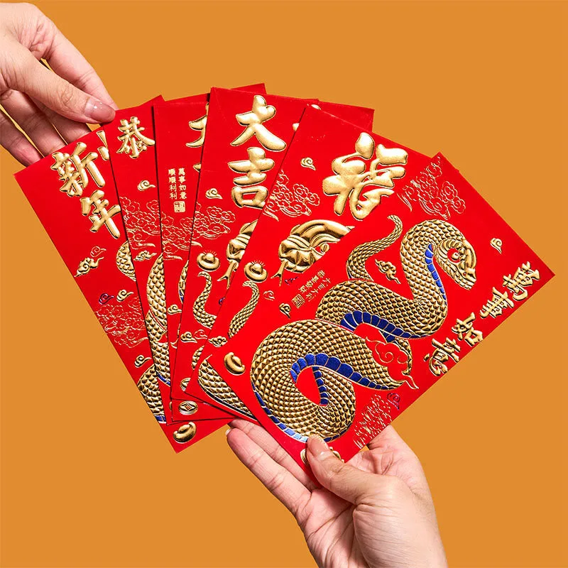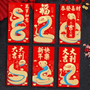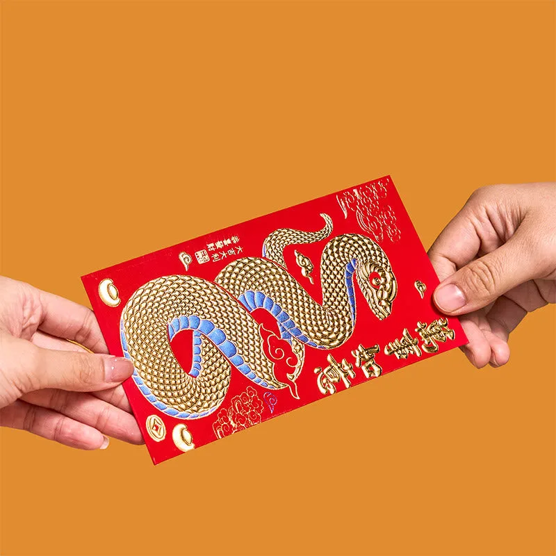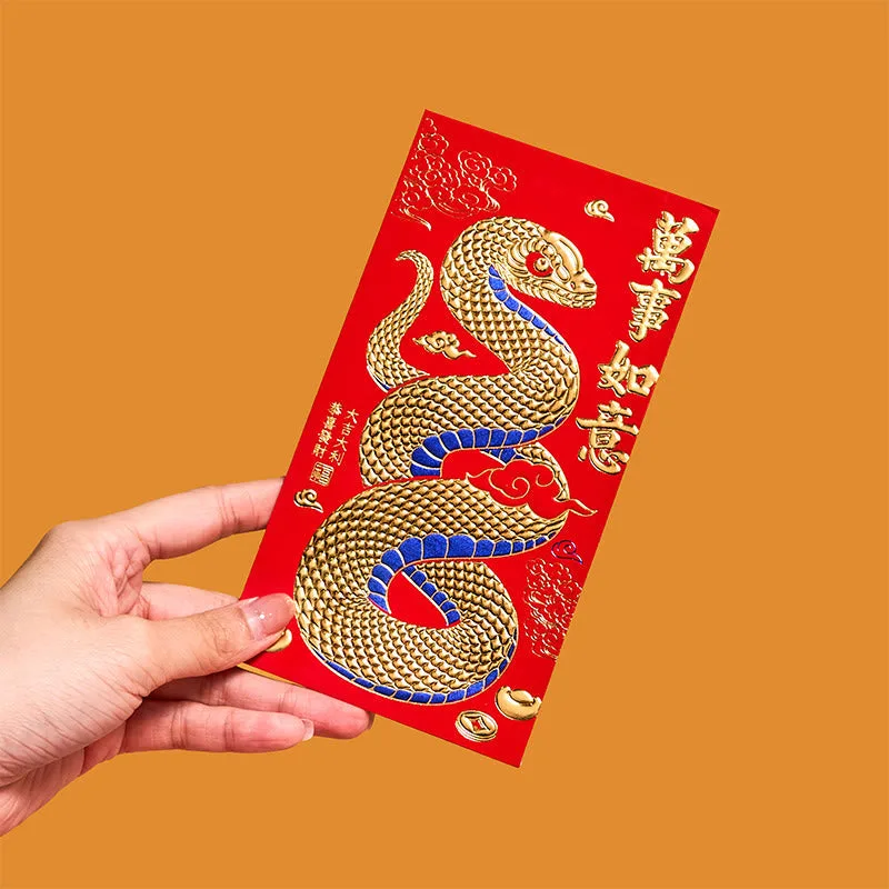 All The Best Red Envelope features a golden snake with a striking blue belly and intricate golden text symbolizing blessings and prosperity. These envelopes are perfect for gifting lucky money during the 2025 Chinese New Year. representing good fortune and heartfelt wishes. Crafted from high-quality paper. they are a meaningful way to convey blessings and joy to friends and family.