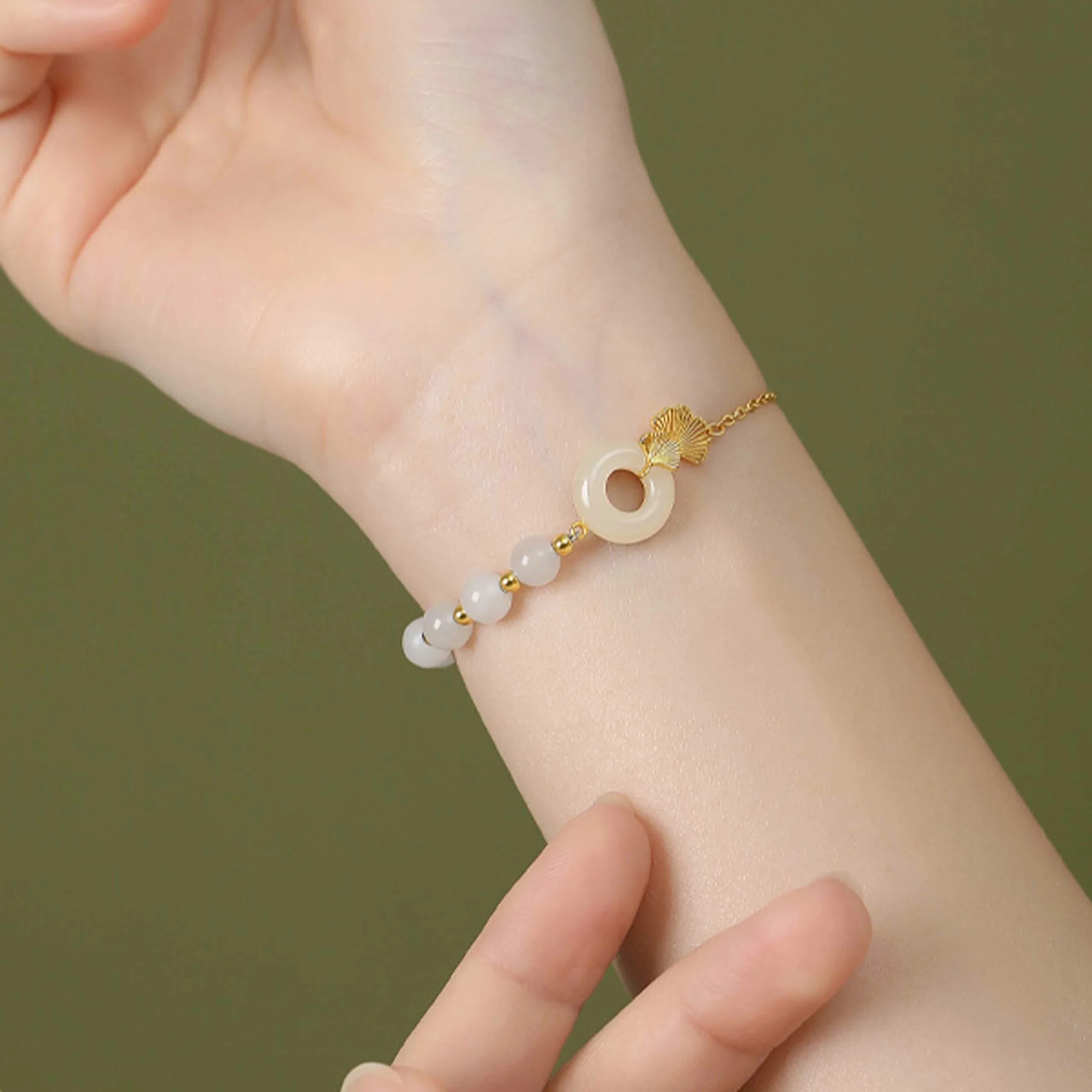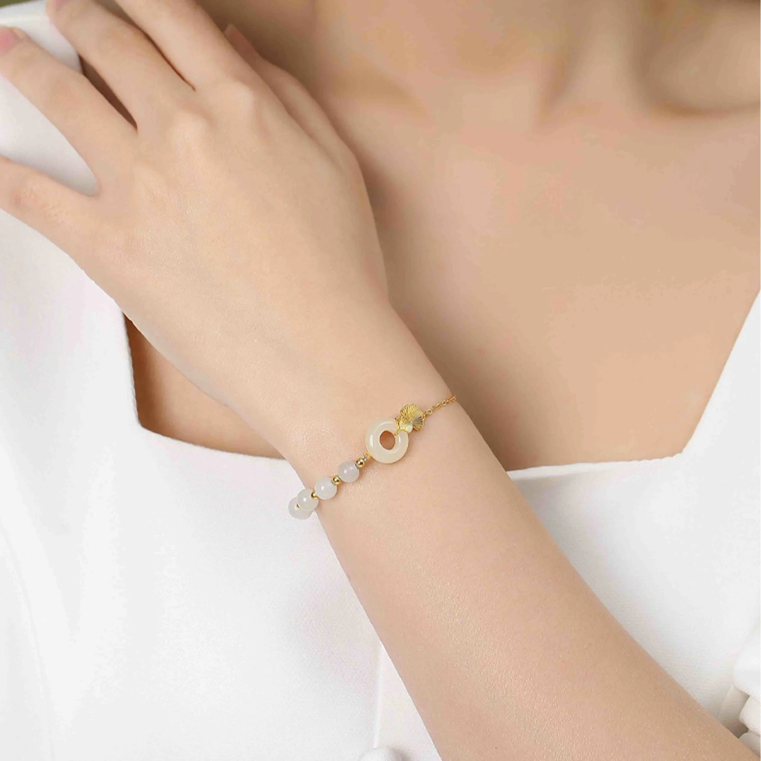 Mythstone 925 Sterling Silver Hetian White Jade Peace Buckle Ginkgo Leaf Luck Bracelet