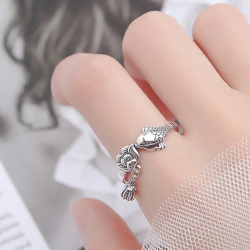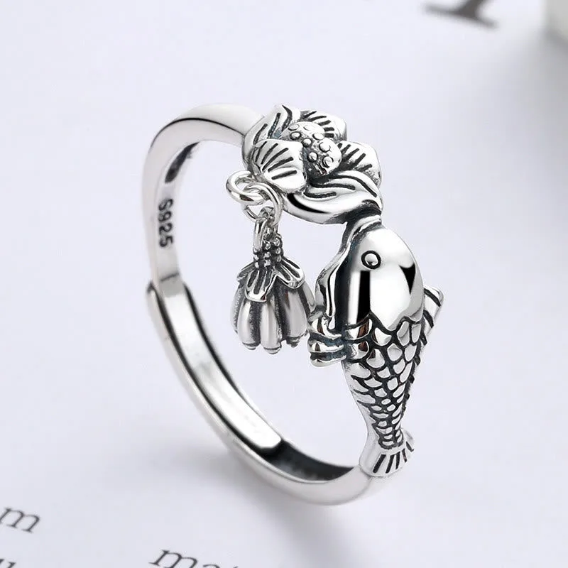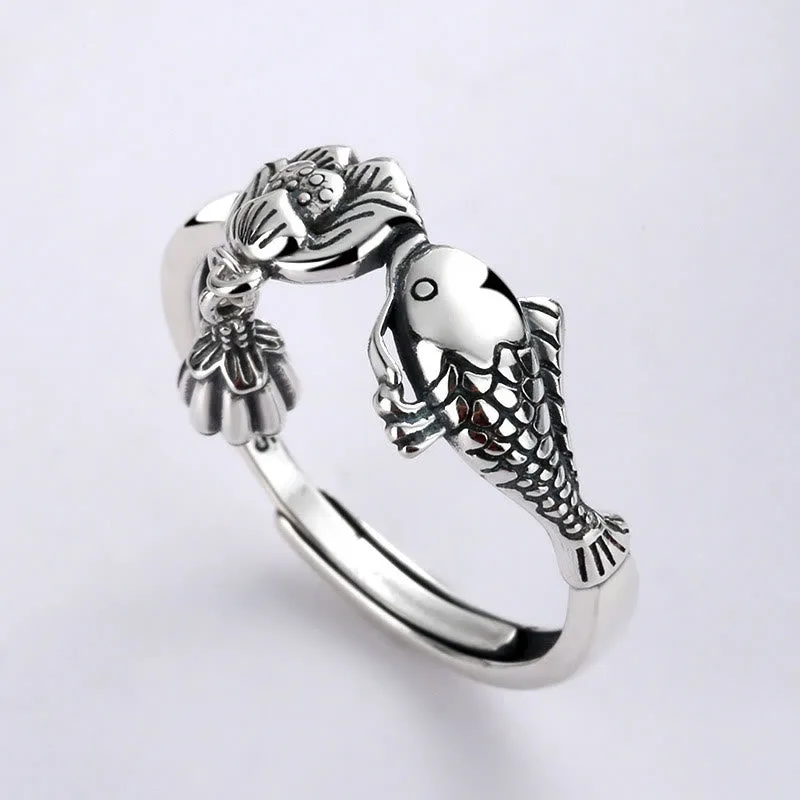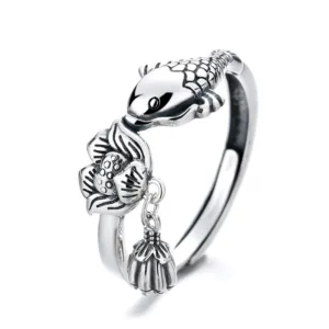 Sterling Silver Success ring combines the symbolism of the koi fish and lotus flower. representing perseverance and purity. The koi fish and lotus are beautifully crafted at each end. with a delicate lotus seed pod charm hanging below the lotus. This ring embodies the journey toward success and the harmony found in overcoming obstacles.