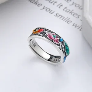 Silver Koi Fish Lotus ring features intricate carvings of “Everything Goes Well” in Chinese characters. alongside colorful Koi fish and Lotus designs. Crafted from 925 sterling silver. this ring combines symbolic imagery with high-quality material to offer a meaningful accessory. The vibrant colors and detailed engravings make it a unique piece that embodies positive energy and well-wishing.