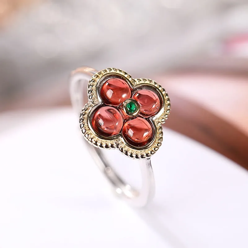 Sterling Silver Garnet setfeatures a four-leaf clover design symbolizing protection and luck. Made from 925 sterling silver and natural garnet. this pendant and ring set exudes elegance and positive energy. Ideal for daily wear or special occasions. it brings a touch of charm and spiritual significance to any outfit. A thoughtful accessory for those who appreciate meaningful jewelry.