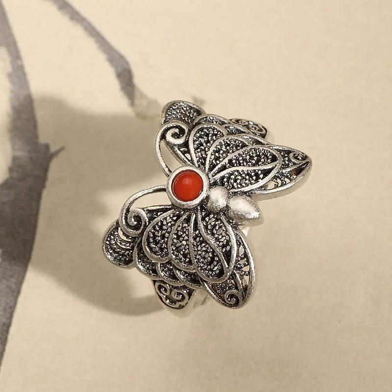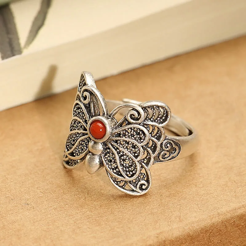 Red Agate Butterfly set features red agate with butterfly motifs. symbolizing self-acceptance and transformation. This set includes a ring and earrings. crafted from 925 sterling silver. The red agate promotes emotional balance and confidence. while the butterfly represents growth and change. making this set ideal for those seeking to embrace self-love and positive energy in their spiritual journey.