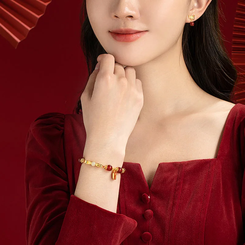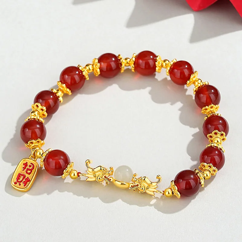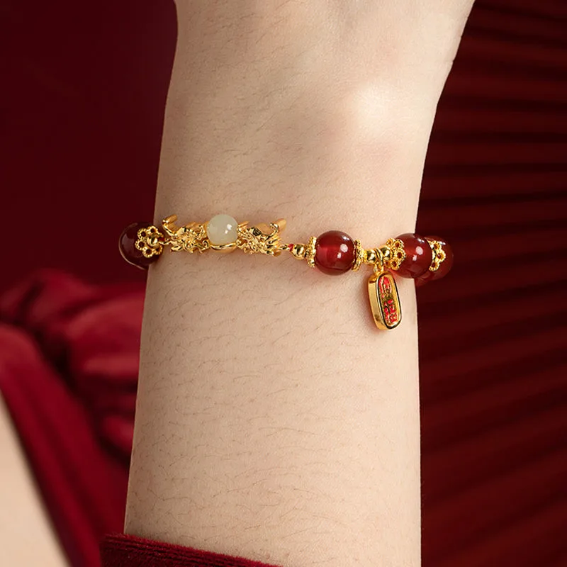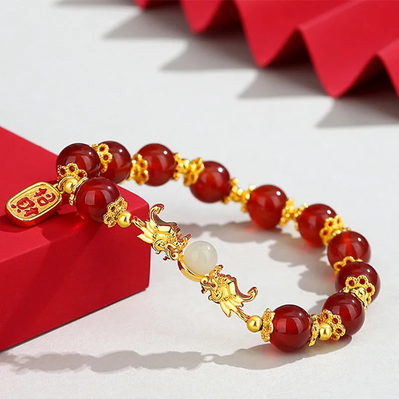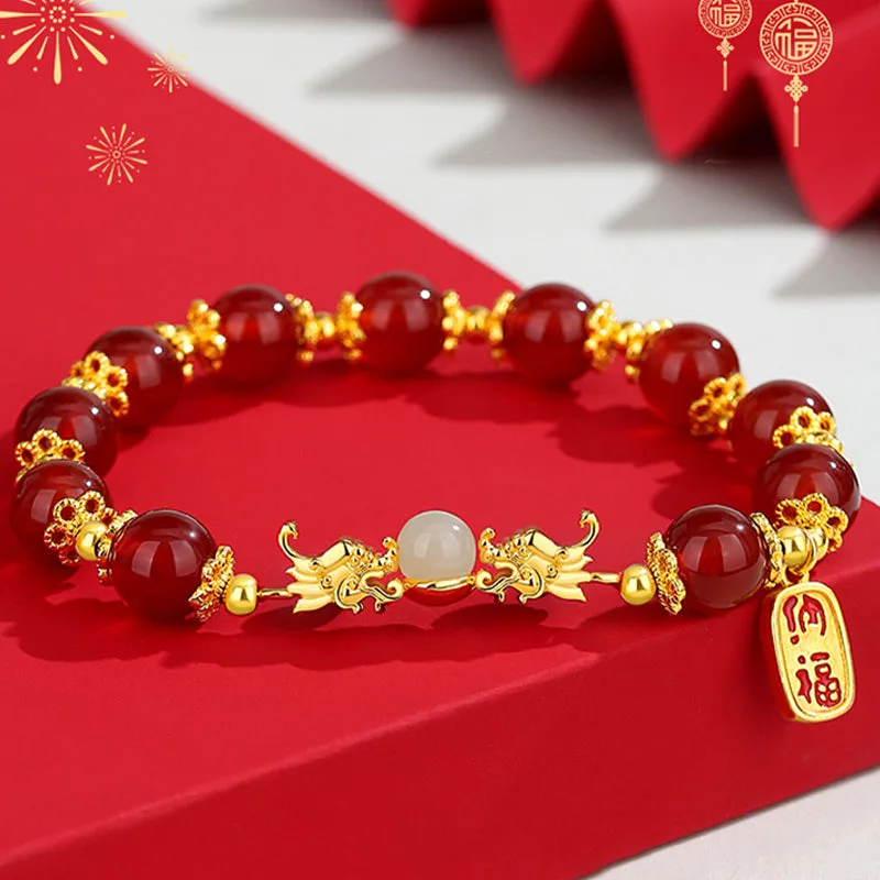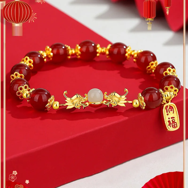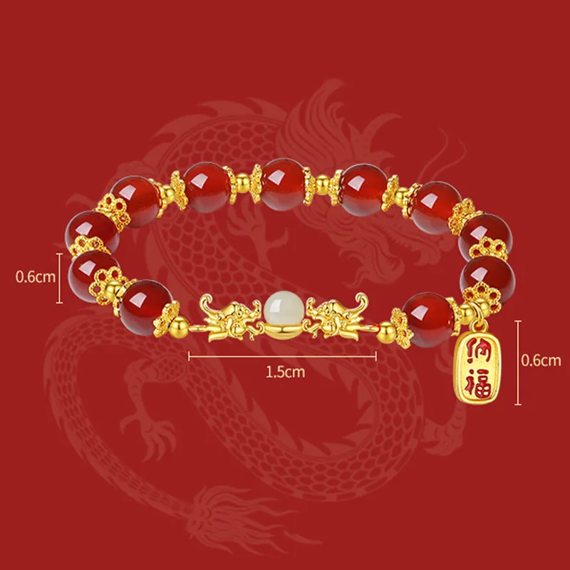 The Red Agate Hetian Jade Fu Character bracelet is a harmonious blend of cultural richness and spiritual depth. Crafted with the potent symbols of the dragon for luck and protection. Hetian jade for realizing dreams. and red agate for enhancing logical thinking and confidence. this piece is further empowered by the Fu character for happiness and good fortune. Ideal for those seeking balance. wellness. and a touch of auspicious energy in their lives.