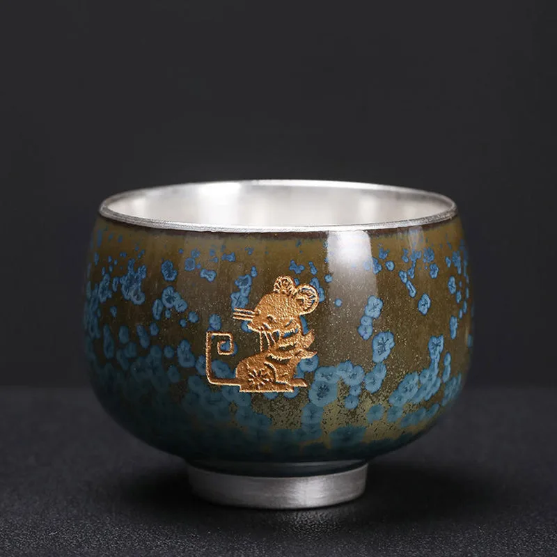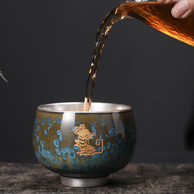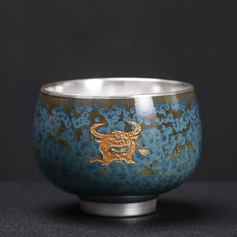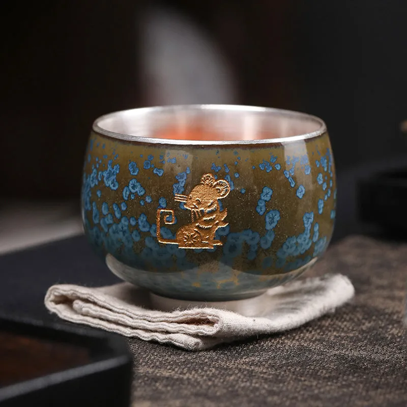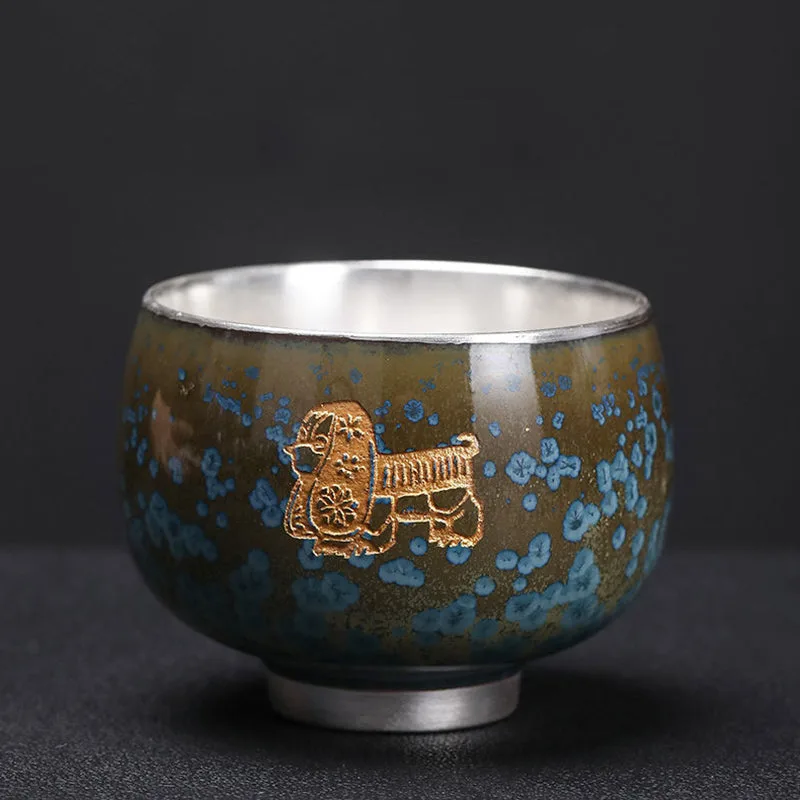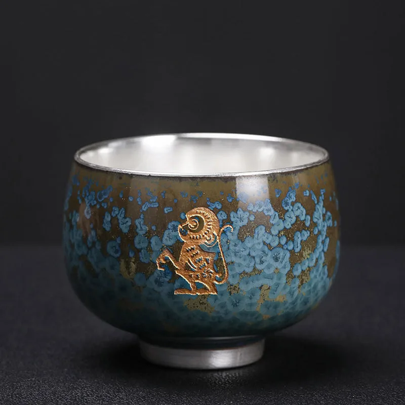 Mythstone 999 Gilt Silver Gilt Chinese Zodiac Ceramic Teacup Kung Fu Tea Cup 160ml