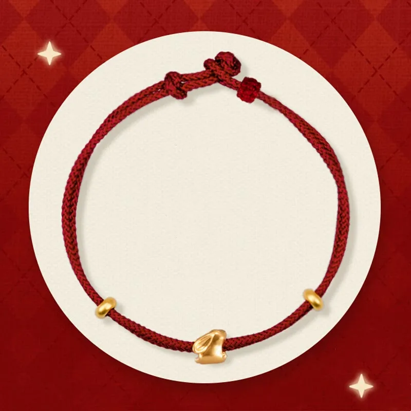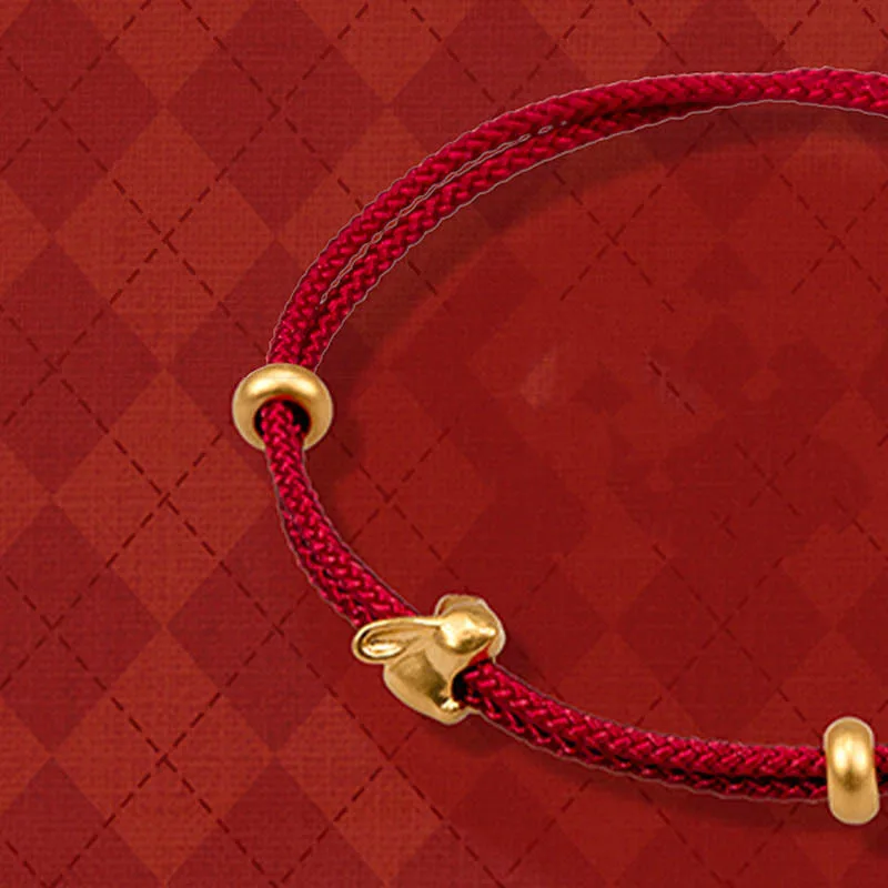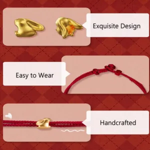 GoldLucky Rabbit bracelet features a central 999 gold rabbit charm. complemented by gold beads on each side. The handcrafted design combines a durable braided rope with a symbolic rabbit motif. representing good fortune and positive energy. The bracelet’s gold accents are not only visually appealing but also enhance its significance as a talisman for attracting luck and prosperity.