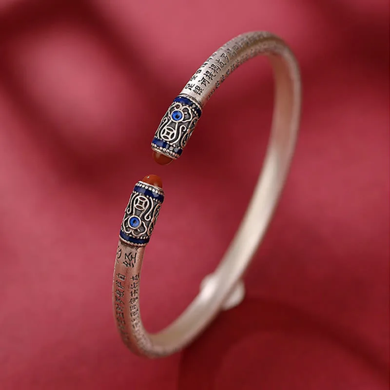 The Mythstone 999 Sterling Silver Heart Sutra Engraved Red Agate Protection Bracelet Bangle is a beautiful and meaningful piece of jewelry. Crafted from high-quality sterling silver and adorned with a red agate stone engraved with the Heart Sutra. it offers both aesthetic appeal and spiritual significance. Perfect for those seeking protection and inner peace.