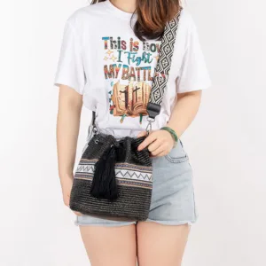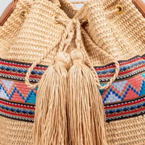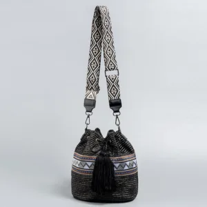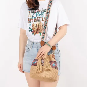 Straw Woven Bucket bag blends coastal charm with practicality. Crafted from natural straw. this bag features a stylish geometric pattern and playful tassels. Its bucket shape offers ample space for your essentials. making it perfect for beach outings or daily use. Embrace the carefree spirit of summer with this versatile and elegant crossbody bag.