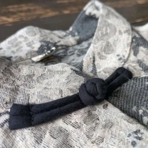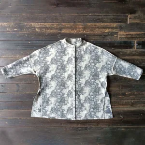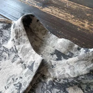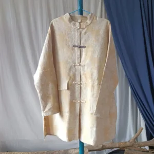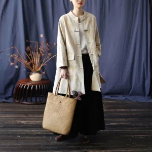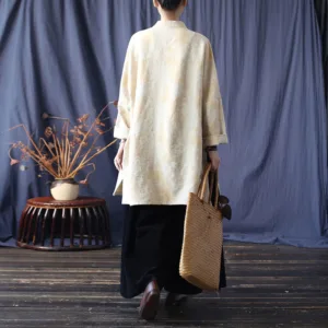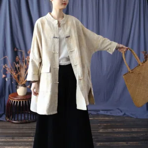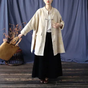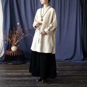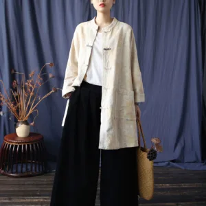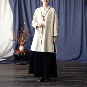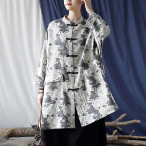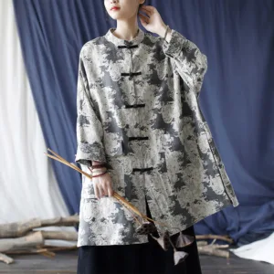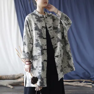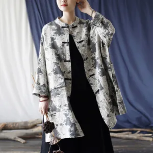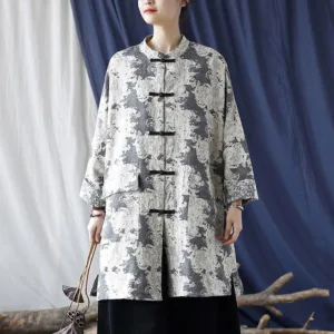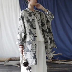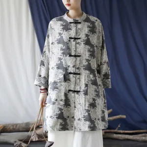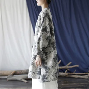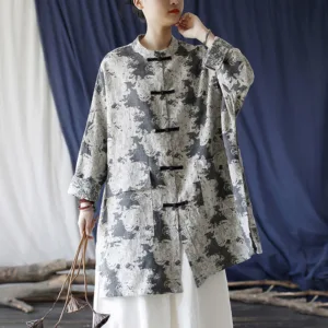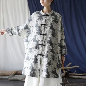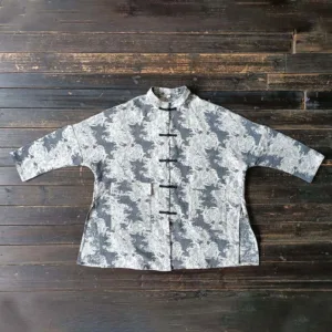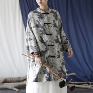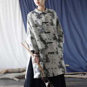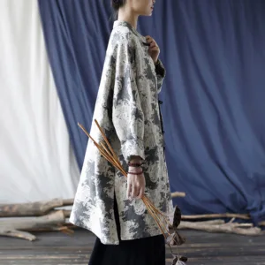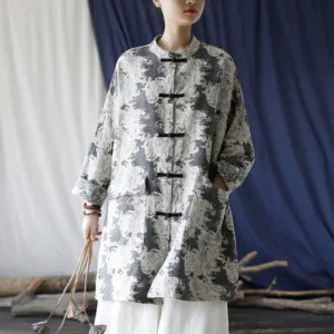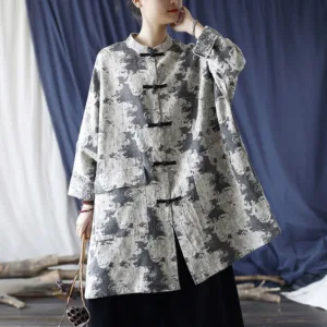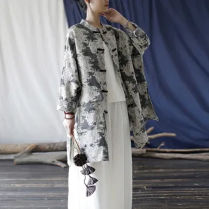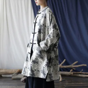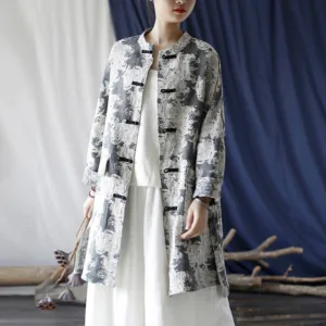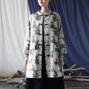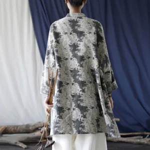 Black Gray Beige jacket features a unique frog-button design. combining elegance with cultural heritage. This long sleeve cotton linen shirt includes convenient pockets. perfect for daily use. The intricate print symbolizes balance and tranquility. making it a meaningful addition to your wardrobe. Crafted from high-quality materials. it ensures comfort and durability.
