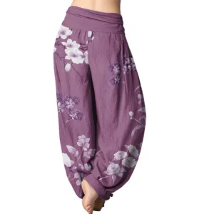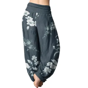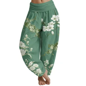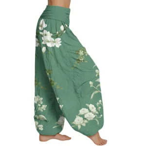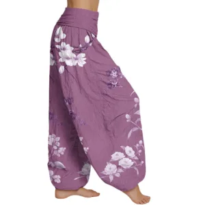 - Design: The harem pants featuringboth blooming and budding flowers alongside leavessymbolize the duality of life. representing both fulfillment and potential. The open flowers signify beauty and achievement. while the unopened buds reflect hope and future possibilities. encouraging wearers to appreciate their current journey while remaining open to growth and new opportunities.