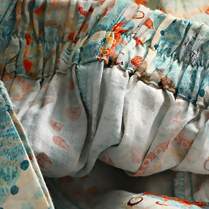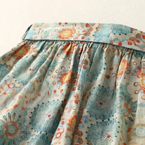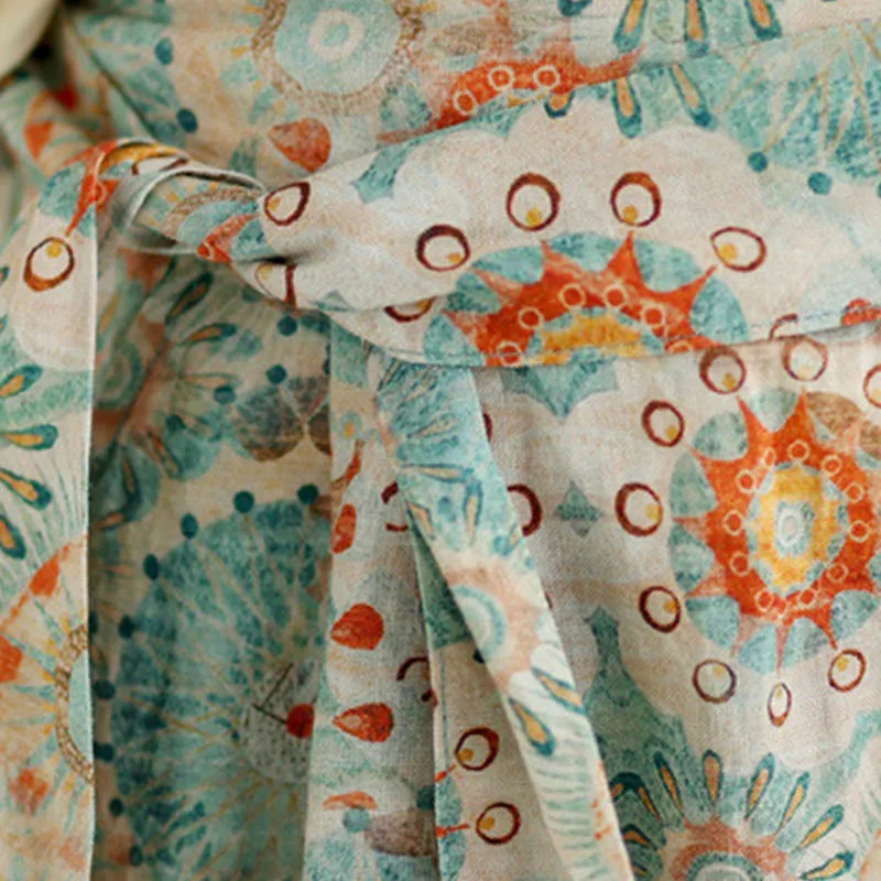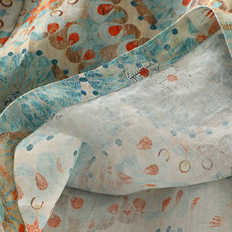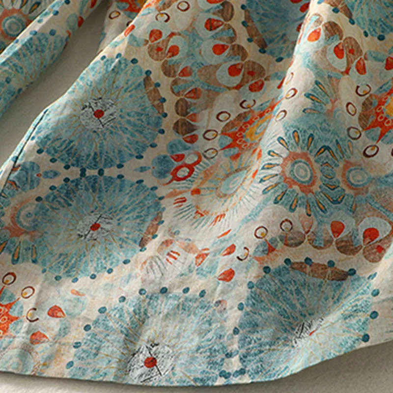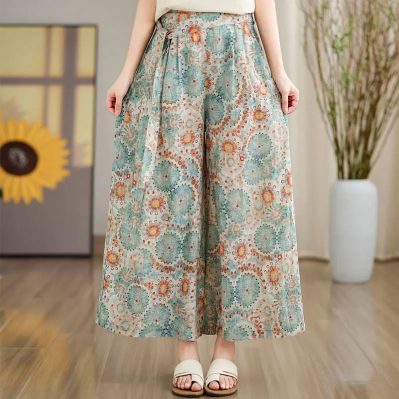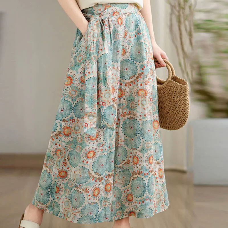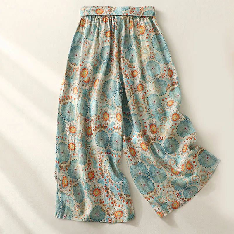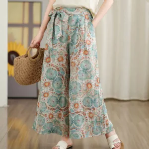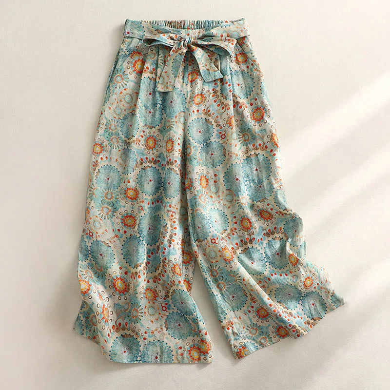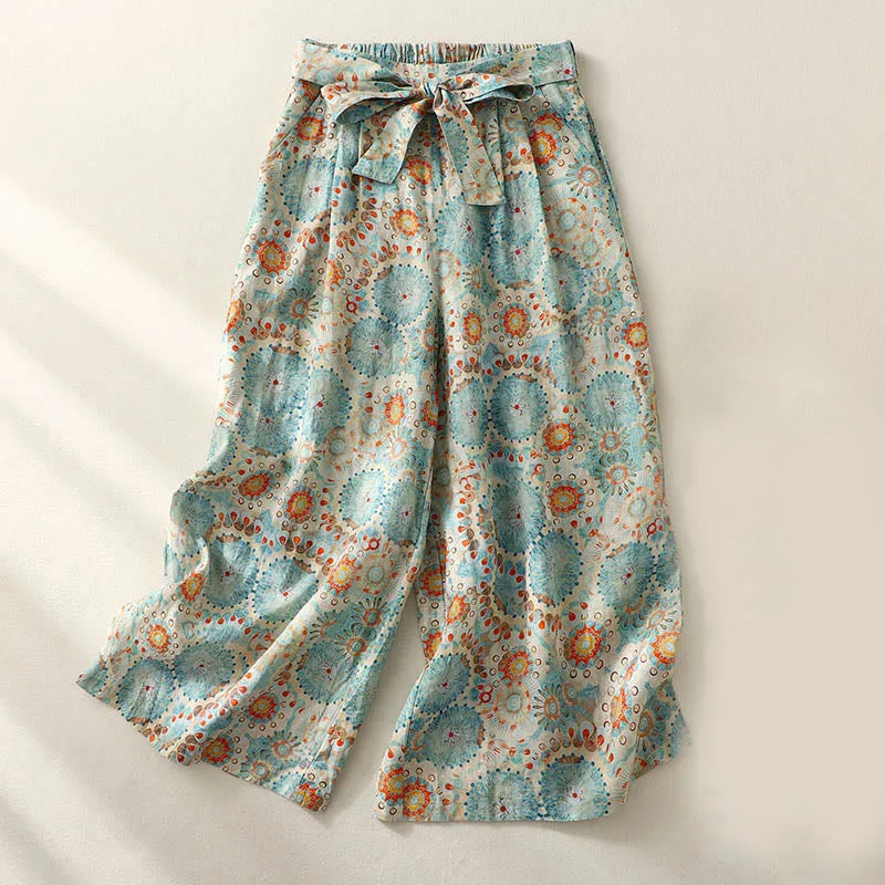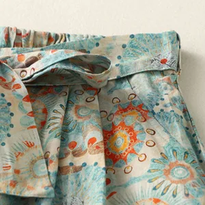 Circular Print Lace-up pants feature a breathable cotton-linen blend and wide-leg design for ultimate comfort. The lace-up closure ensures a secure fit. while the practical pockets add functionality. The blue circular print adds a distinctive touch to these versatile pants. making them ideal for a variety of activities. Designed for ease of movement and practical use. they offer both comfort and style.