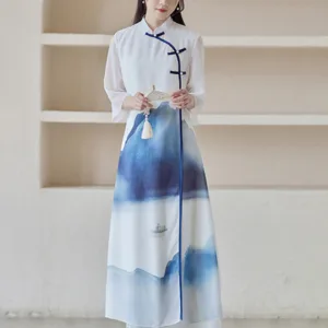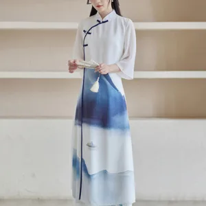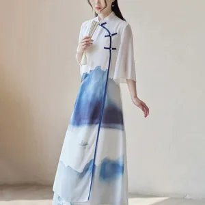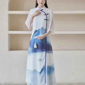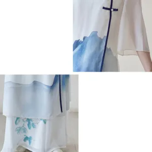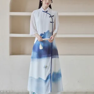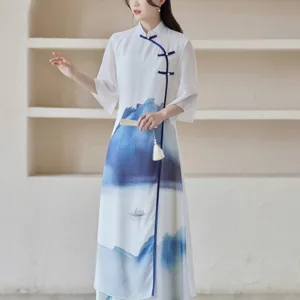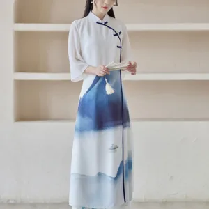 Blue Landscape Painting dress features a beautiful three-quarter sleeve design with a traditional Chinese cheongsam cut. The serene blue landscape painting evokes tranquility and harmony. making this midi dress perfect for spiritual gatherings and meditation. Crafted from breathable fabric. it ensures comfort while promoting a sense of peace and balance. ideal for those seeking mindfulness in their daily life.
