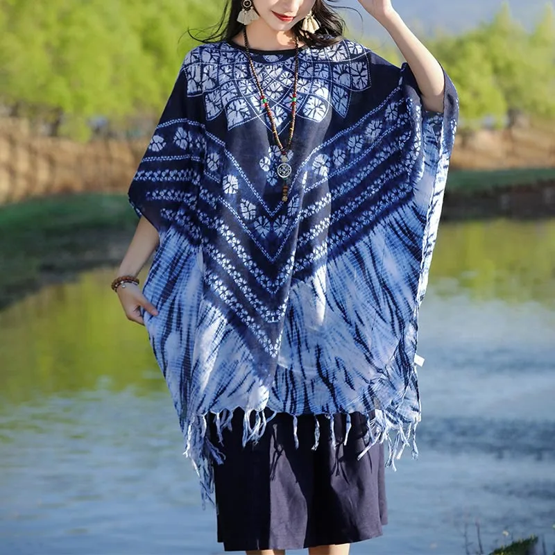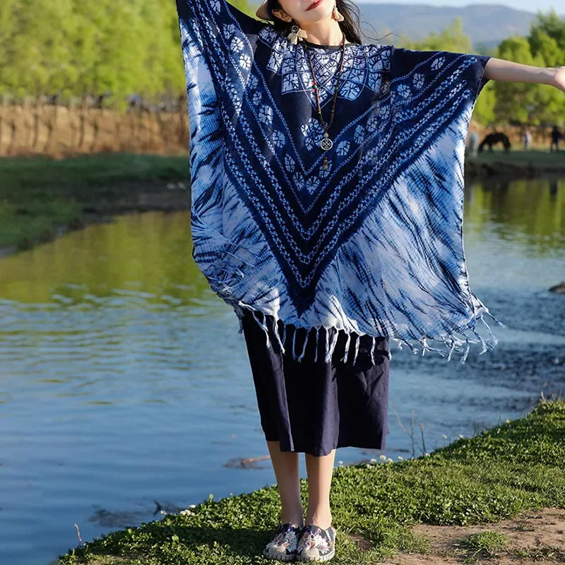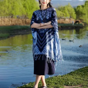 Blue Striped Floral Indigo Dyeing shawl melds vivid floral prints with classic stripes. all enhanced by the deep shades of indigo dye. Adorned with tassels. this cozy pullover shawl adds a layer of warmth and style to any ensemble. It’s designed for those who appreciate the fusion of traditional dye techniques with modern aesthetics. making it a standout choice for travel or everyday elegance.