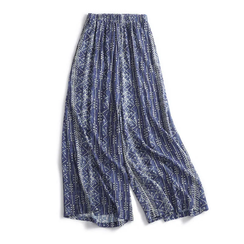 Blue Stripes Print Cotton Linen pants feature a vibrant blue fabric with contrasting white stripes. offering a refreshing design. Made from a blend of cotton and linen. these pants provide comfort and breathability. while the pockets add functionality. The wide leg cut ensures ease of movement. making these pants a practical choice for those seeking both comfort and a touch of distinctive design in their wardrobe.