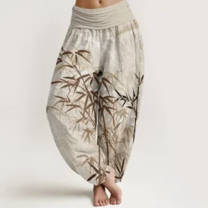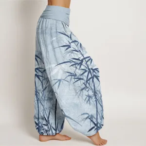 - Design: The harem pants feature a sophisticated bamboo design. with tall. elegant stalks and flowing leaves that create a peaceful. natural aesthetic. The intricate bamboo pattern gracefully wraps around the fabric. evoking a sense of tranquility and balance. This artistic design brings a refined and organic touch to the pants. making them a stylish and unique piece.